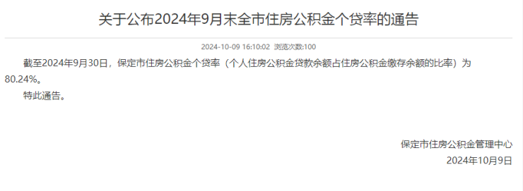 2024年10月9日, 保定市住房公积金管理中心公布9月末全市住房公积金个贷率。截至2024年9月30日,保定市住房公积金个贷率(个人住房公积金贷款余额占住房公积金缴存余额的比率)为80.24%。