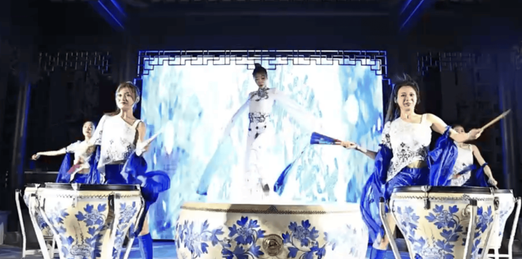 青花鼓舞震撼开场,鼓点慷慨激昂,舞者衣袂飘飘,淋漓尽致地展露出中国古典文化含蓄而奔放的神采。