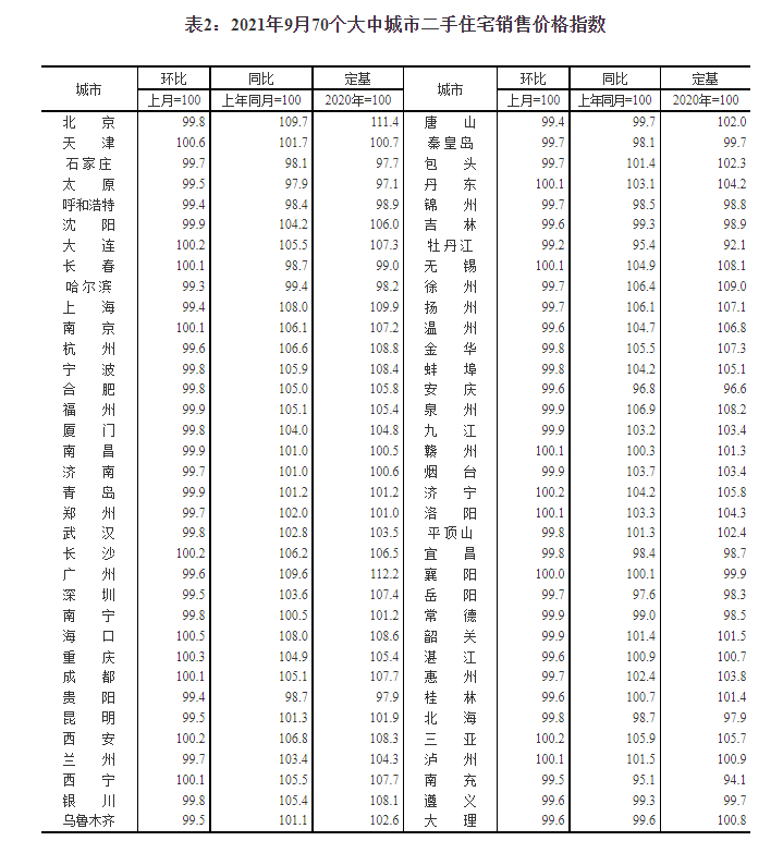 10月20日,国家统计局发布2021年9月70个大中城市商品住宅销售价格变动情况。从全国70个大中城市房价数据看,9月份新建商品住宅上涨城市数量为27个,较8月份减少19城;二手房价格上涨城市数量为17个,较8月份再减少10个。