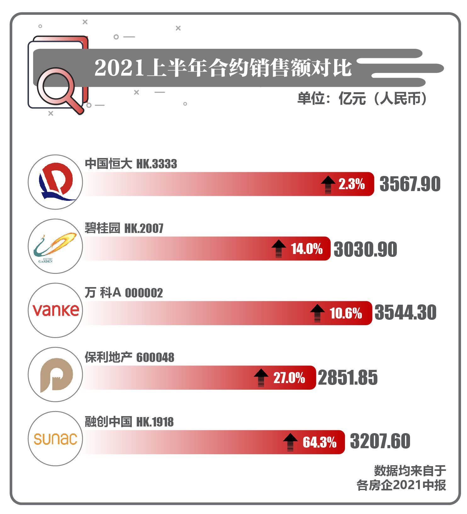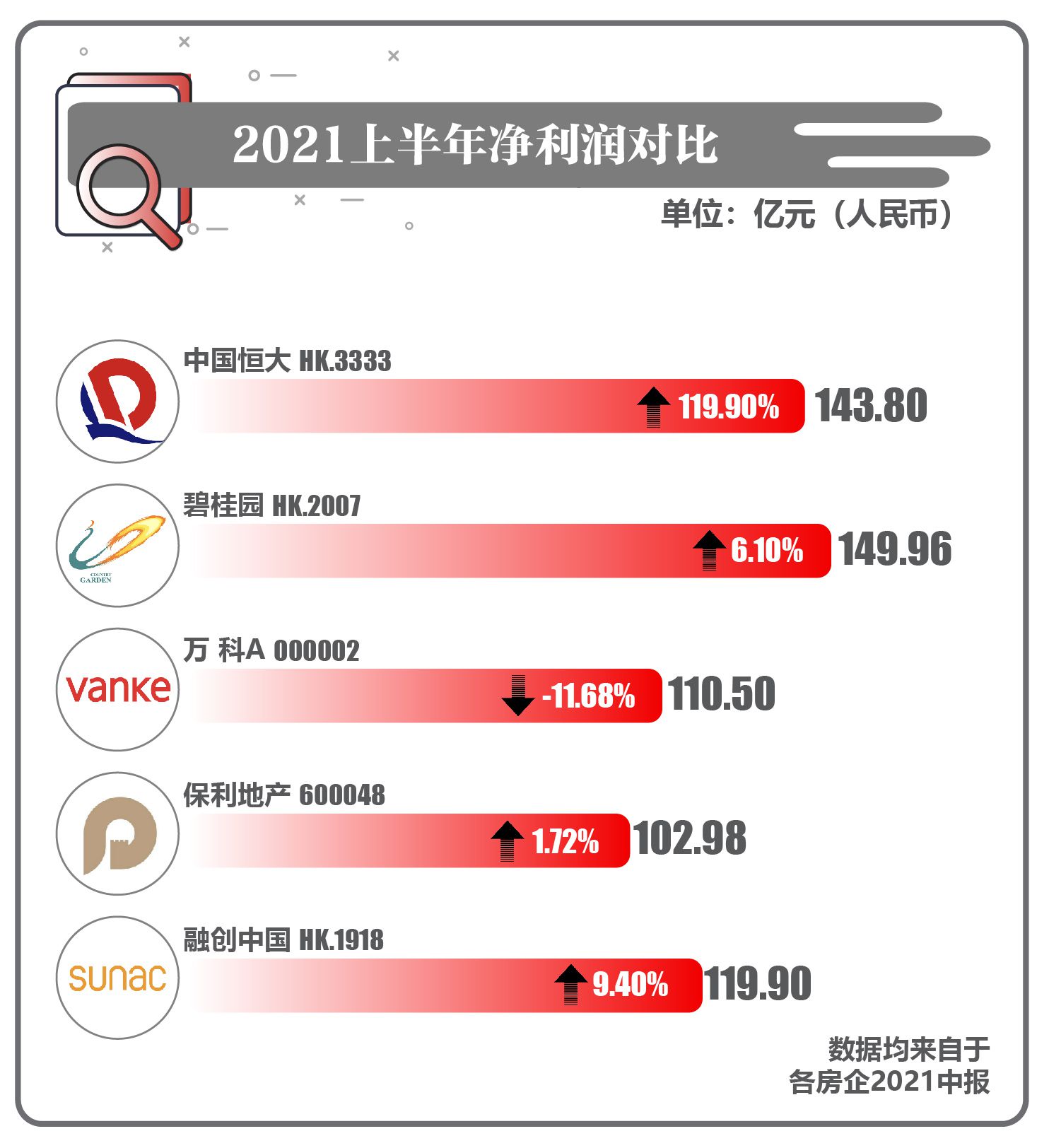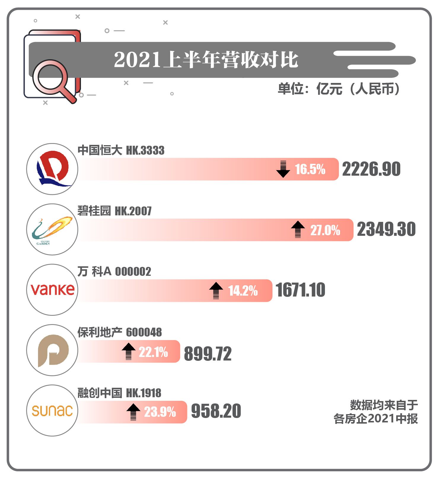 结合中国房地产TOP10研究组、中指研究院联合发布的《2021中国房地产百强企业研究报告》。排名前列财经选择榜单中综合排名前五的房地产公司,对其中报进行梳理。