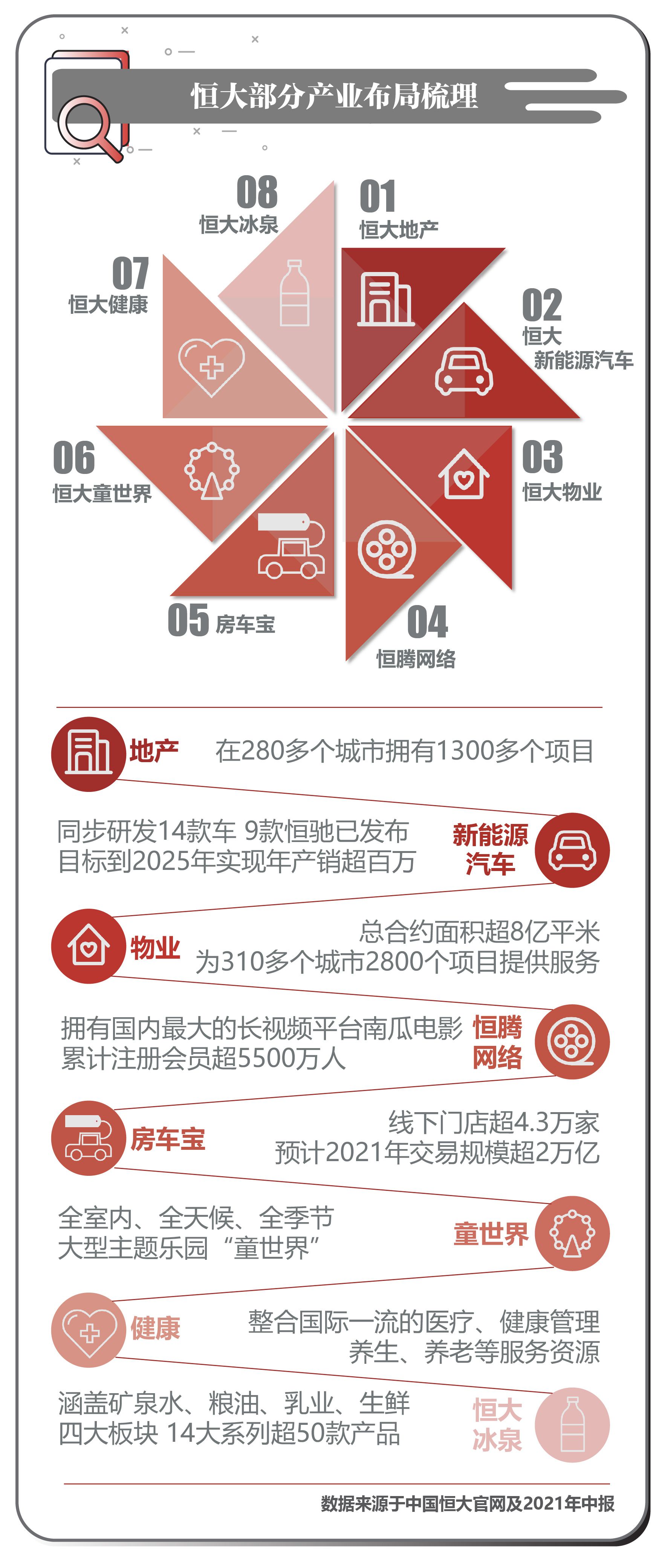 据恒大集团官网,恒大旗下拥有恒大地产、恒大新能源汽车、恒大物业等八大产业,为数亿用户提供全方位服务。