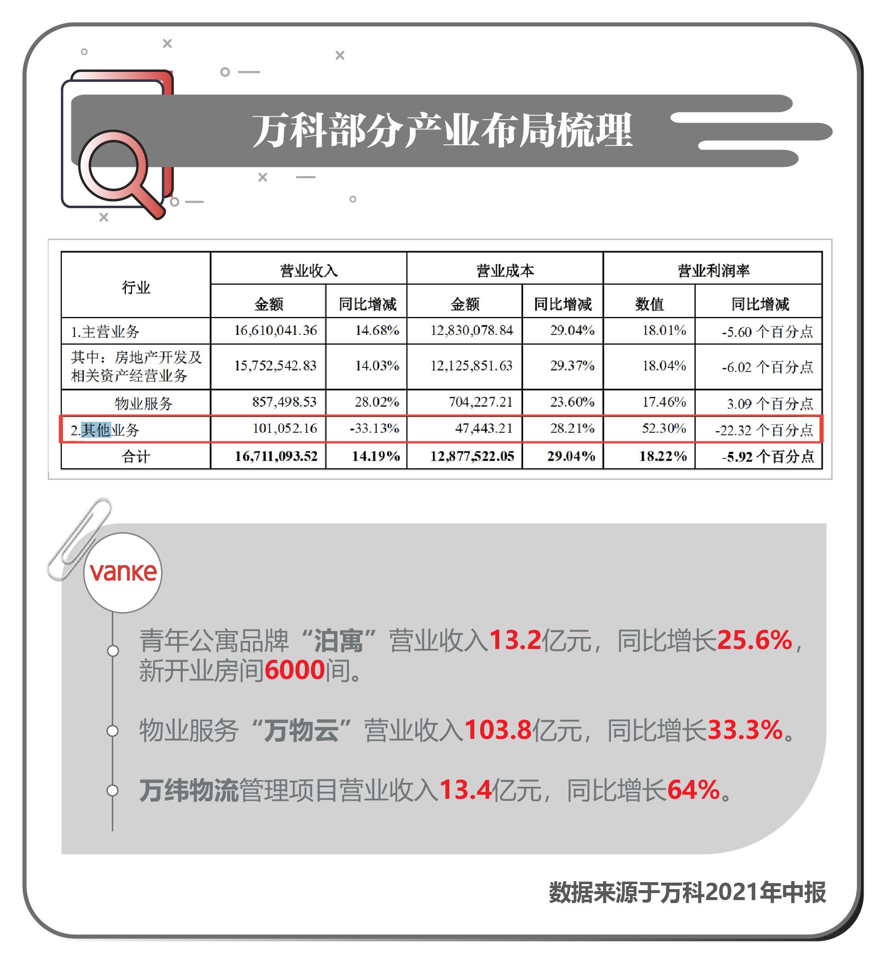 从上半年万科的营业收入中,来自房地产开发及相关资产经营业务(含长租公寓、物流、商业等经营性业务)的收入为1575.3亿元,占比94.3%;来自物业服务的营业收入为85.7亿元,占比5.1%;其他业务的营业收入为10.1亿元。