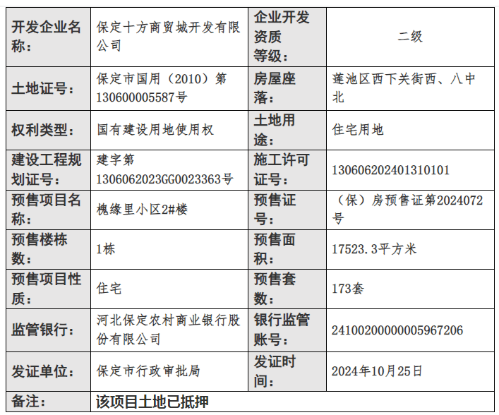 2024年10月25日,保定市行政审批局公布了一则商品房预售许可证下发信息,槐缘里项目2#楼获发预售证,预售面积17523.3平方米,预售套数173套,预售证号(保)房预售证第2024072号。…