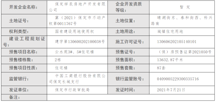2021年7月21日,保定市行政审批局发布商品房预售公告,云玺首府(云水苑)3#、5#住宅楼获预售证,预售栋数2栋楼,预售面积13632.87平米,预售套数87。预售证号:(保)房预售证第2021050号。
