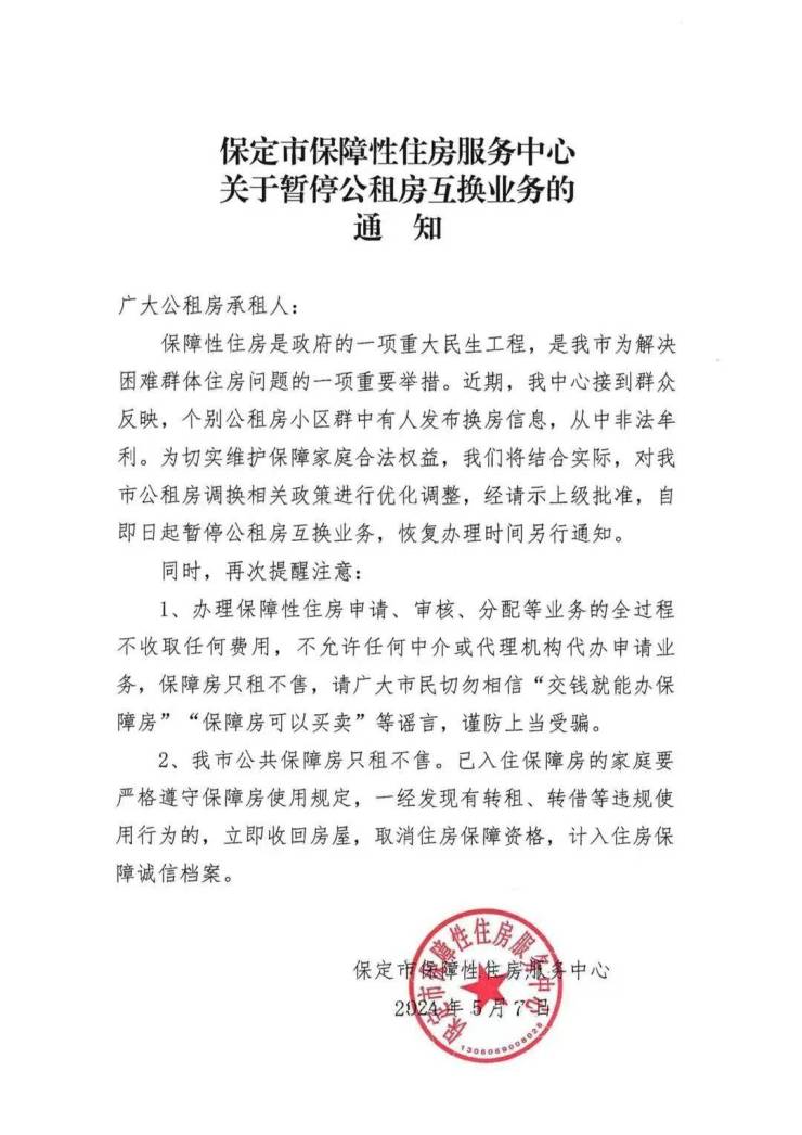 2024年5月7日,保定市保障性住房服务中心发布关于暂停公租房互换业务的通知。因个别公租房小区群中有人发布换房信息,从中非法牟利。为切实维护保障家庭合法权益,保定市保障性住房服务中心将结合实际,对保定市公租房调换相关政策进行优化调整。