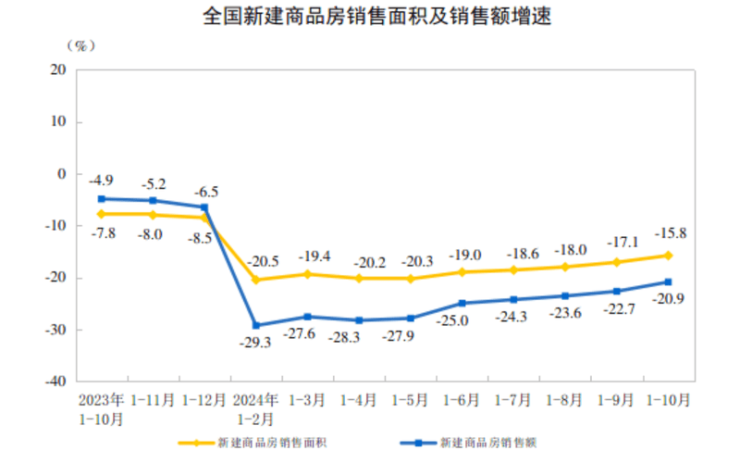 11月15日,国家统计局发布全国房地产市场基本情况显示,1-10月份,新建商品房销售额约7.69万亿元,下降20.9%。在一系列政策影响下,10月份房地产市场交易提速,房地产销售面积、销售额累计降幅持续收窄。