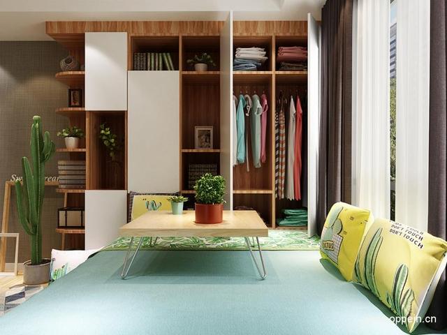 大容量衣柜和双人榻榻米拼接设计,可以储存大量衣物、被子;轻松舒适的榻榻米可做休闲之用,也可作次卧,一物多用,功能强大。捧一本书窝在这里,打发一下午的时光,也是极好的。