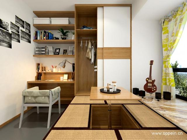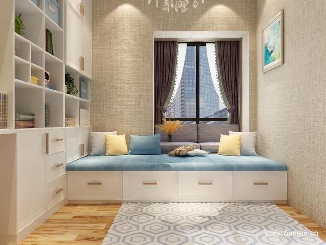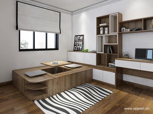 要想在飘窗处打造一个休闲场所,那么非榻榻米莫属。抬高地台,铺上软垫,双人榻榻米的加入开辟出休闲享乐的空间,榻榻米地柜的抽屉设计与拼接的书柜形成以,提供储物空间,而且也方便留宿。
