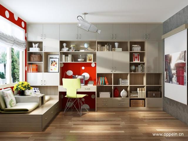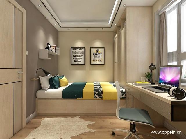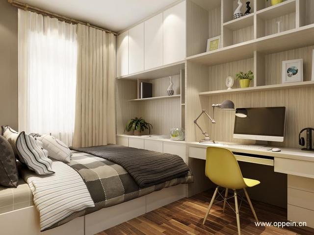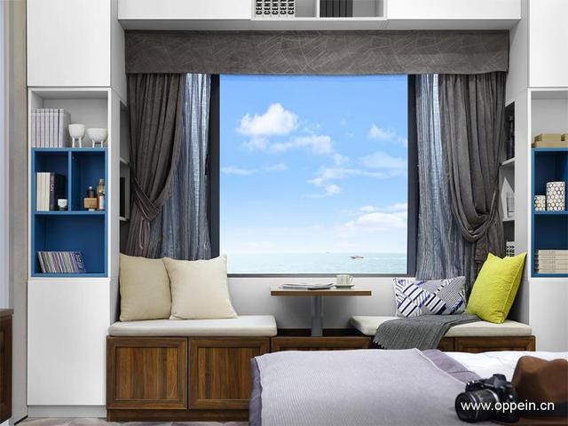 双人榻榻米靠飘窗设计,与做满墙面的书柜连成一体,书桌内嵌于书柜中,节省了不少空间。双人榻榻米休闲舒适,底部抽屉设计,还可方便储物。坐在这里还可以看看电影、听听音乐,周末都可在家宅一天。