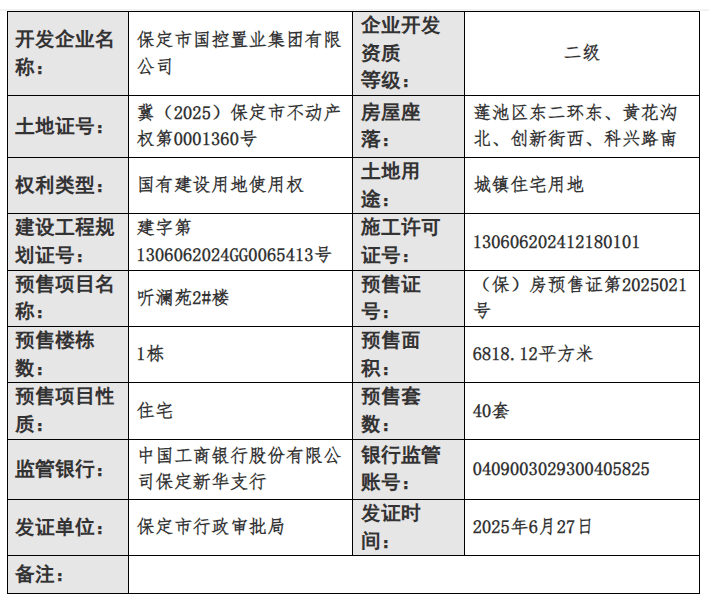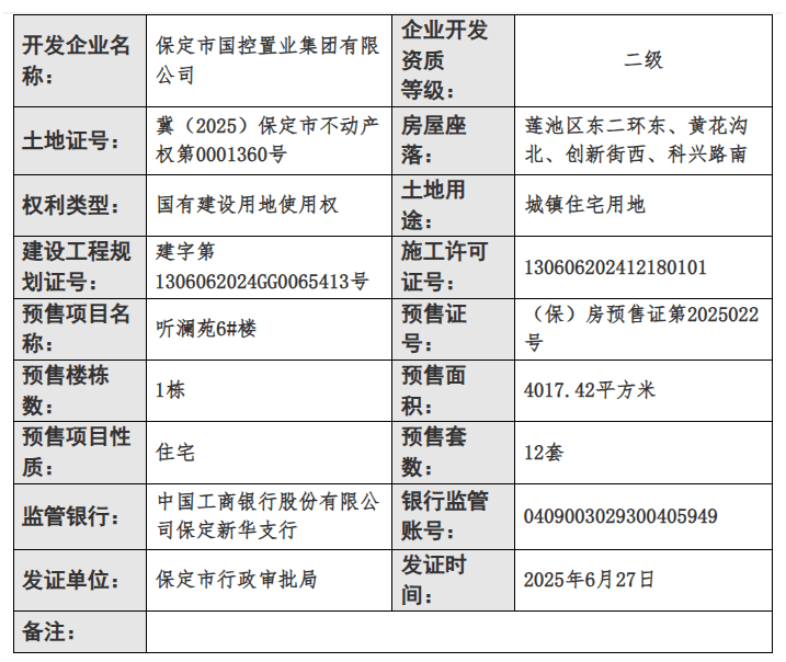 保定国控置业听澜苑项目获预售,预售总房源120套
