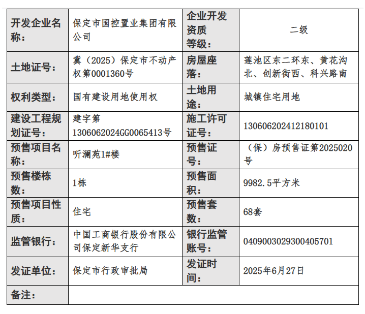其中听澜苑1#住宅楼预售面积9982.5平方米,预售套数68套,预售证号:(保)房预售证第2025020号。