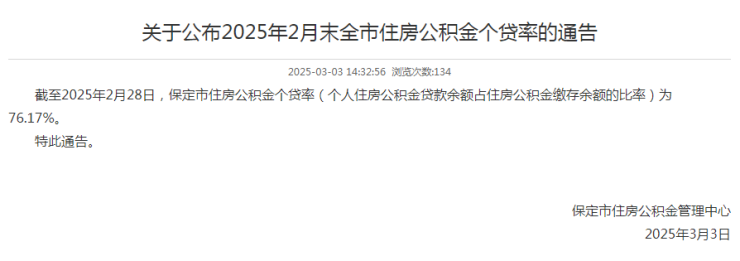 2025年2月末保定住房公积金个贷率76.17%