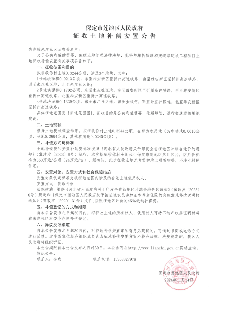 保定焦庄镇朱庄征收土地补偿安置公告 土地补偿费24万元/亩