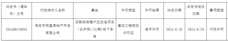 2024年6月20日,保定市自然资源和规划局公布了最新建设工程规划可证信息下发情况,保定市同盛房地产开发有限公司话剧院街棚户区改造项目(云庐苑)(三期)地下车库获建设工程规划许可证。