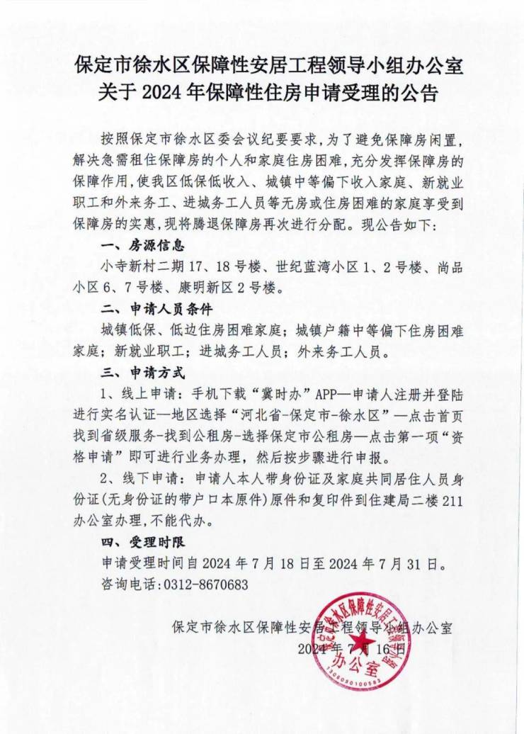 按照保定市徐水区委会议纪要要求,为了避免保障房闲置,解决急需租住保障房的个人和家庭住房困难,充分发挥保障房的保障作用,使我区低保低收入、城镇中等偏下收入家庭、新就业职工和外来务工、进城务工人员等无房或住房困难的家庭享受到保障房的实惠,现将腾退保障房再次进行分配。现公告如下: