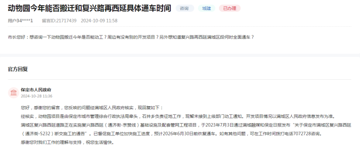 满城区答复市民关于保定动物园搬迁及复兴路西延具体通车时间的问题,现暂未接到上级部门动工通知,预计2026年6月30日前恢复通车。