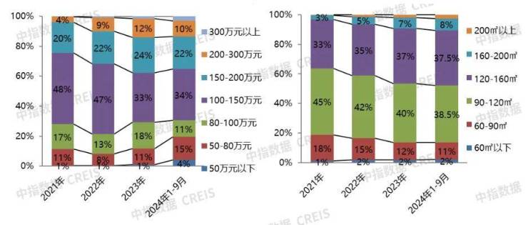 从成交结构来看,2024年1-9月,总价段80-100万、面积段在90-120平之间产品成交占比下滑明显。成交总价段,100-150万之间产品成交占比34%,较2023全年增加1.5个百分点,居首位;150-200万之间产品成交占比为22%,较2023全年减少2.0个百分点,居第次席;50-80万之间产品成交占比较2023全年增加4.7个百分点至15%,居第三位;80-100万之间产品成交占比为11%,较2023年减少6.9个百分点;50万以下产品成交占比约为4%,较2023全年增加3.2个百分点;200万以上豪宅项目成交套数占比微降。成交面积段,90-120平之间产品成交占比为38.5%,居首位,但占比延续回落趋势;120-160平之间产品成交套数占比居次席,占比为37.5%,占比小幅增加;90平以下产品成交套数占比约为13%,较去年全年小幅减少;160平以上高端改善产品成交占比约为11%,较2023全年增加1.0个百分点。