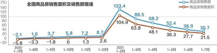 四是商品房销售增速放缓,房价涨幅回落。今年1~7月,商品房销售面积、销售额两年平均增速连续第二个月同步放缓。今年1~7月份,商品房销售面积101648万平方米,同比增长21.5%;两年平均增长7%。商品房销售额106430亿元,同比增长30.7%,两年平均增长13.1%。商品房销售面积、销售额两年平均增速连续第二个月放缓。