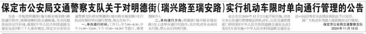 12月2日起,保定明德街(瑞兴路至瑞安路)实行机动车限时单向通行