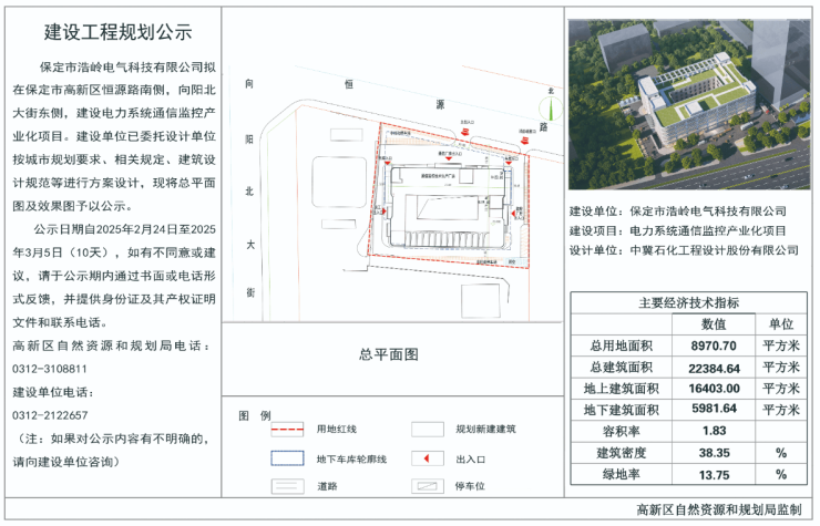 保定市浩岭电气科技有限公司计划在高新区建设电力系统通信监控产业化项目,总平面图及效果图已公示,公众可在公示期内提出意见和建议。