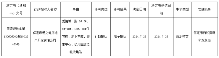 2024年47月30日,保定市自然资源与规划局发布规划核实 ,爱情城一期 1#-3#、5#-13#、15#、16#住宅楼、地下车库、邻里中心、幼儿园及垃圾收集站获规划核实 。
