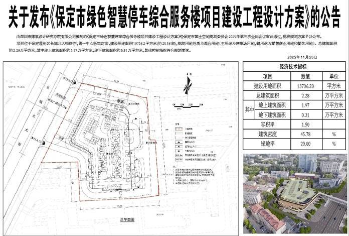 由深圳市建筑设计研究总院有限公司编制的《保定市绿色智慧停车综合服务楼项目建设工程设计方案》经保定市国土空间规划委员会2025年第三次全体会议审议通过,现将规划方案予以公布。