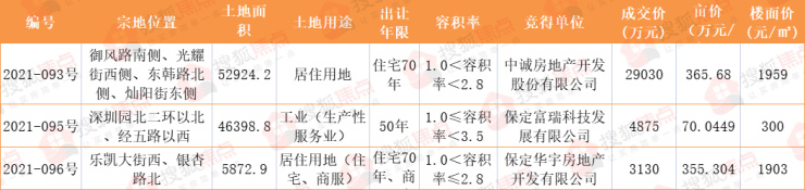 2021年9月,保定市主城区共有3宗地块成功出让,地块成交总面积105195.9平方米(约合157.79亩),包含两宗居住用地,一宗工业用地。