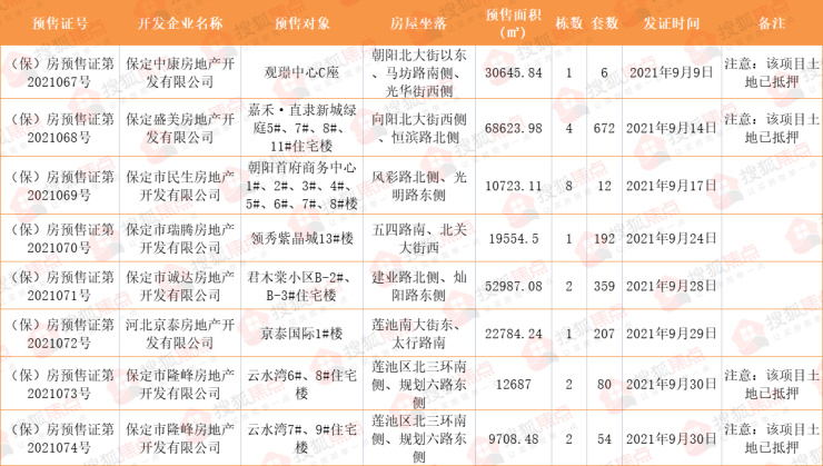 搜狐焦点网自保定市行政审批局获悉,截止到9月30日,9月份保定市主城区共发布8个预售许可证审批信息,预售总面积227714.23㎡,预售总套数1582套。获证项目有观璟中心C座;嘉禾·直隶新城绿庭5#、7#、8#、11#住宅楼;朝阳首府商务中心1#、2#、3#、4#、5#、6#、7#、8#楼;领秀紫晶城13#楼;君木棠小区B-2#、B-3#住宅楼;京泰国际1#楼;云水湾6#、8#、7#、9#住宅楼。【详细信息 如下图】