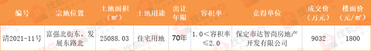保定市清苑区公共资源交易中心显示,2021年9月,清苑区共有一宗住宅用地成功出让,宗地位于富强北街东、发展东路北,宗地面积25088.03㎡,竞得单位为保定市达智尚房地产开发有限公司,成交价9032万元。