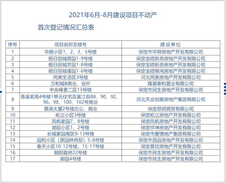 现将保定市主城区2021年6月-8月17个建设项目办理首次登记情况公示如下: