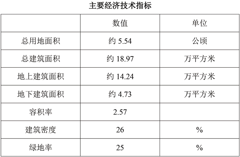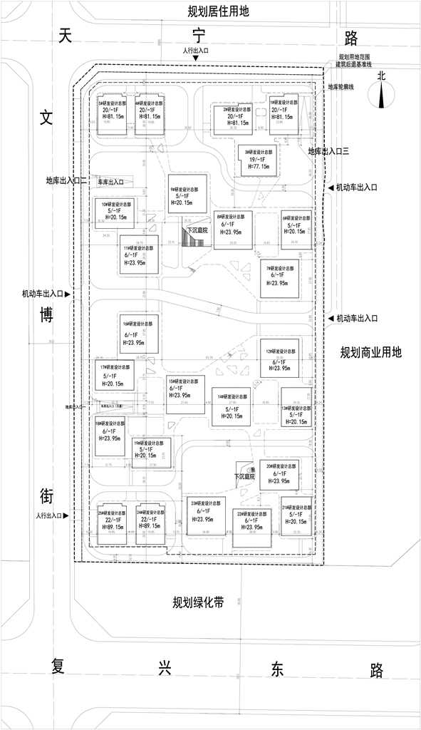 项目位于天宁路南侧、文博街东侧、复兴东路北侧,规划用地性质为工业(生产服务业)用地,规划条件为:容积率≤3.5,建筑密度≤40%,绿地率≥25%。地块规划用地面积约5.54公顷,项目总建筑面积约为18.97万平方米,其中地上建筑面积约为14.24万平方米,地下建筑面积约为4.73万平方米,其他控制指标均符合规划要求。