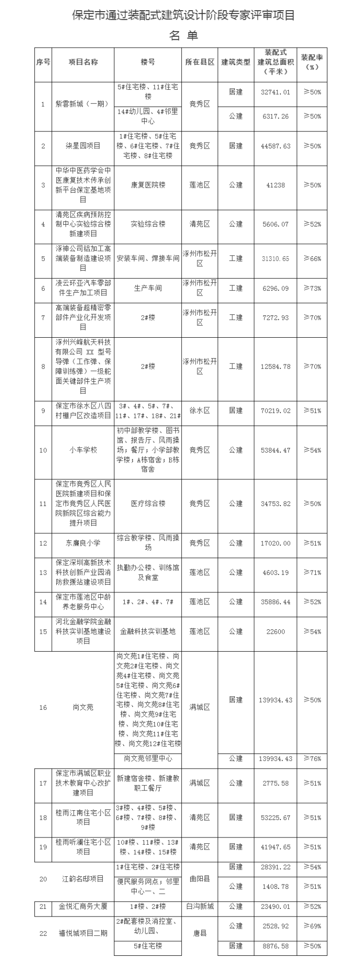 经项目建设单位申请,我局建筑产业现代化促进中心组织专家对保定市竞秀区紫雲新城等项目(具体名单附后)进行了装配式建筑设计阶段 装配率及关键性技术专家评审。现以上项目经专家组认定符合河北省《装配式建筑评价标准》要求,通过设计阶段专家评审。