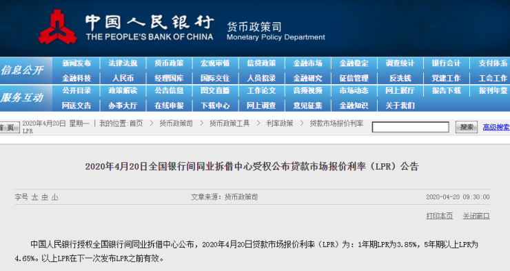 4月20日消息,搜狐焦点获悉,中国人民银行授权全国银行间同业拆借中心公布,2020年4月20日贷款市场报价利率(LPR)为:1年期LPR为3.85%,较上期下调20个基点,5年期以上LPR为4.65%,较上期下调10个基点。以上LPR在下一次发布LPR之前有效。
