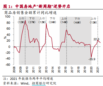 招商证券表达了类似的观点:我国商品房的销售在疫情期间意外地出现一个先跌后扬的V型小周期(参照下图),去年一季度快速陷入谷底,二季度开始反弹,之后一路走高,导致去年全年销售面积达17.6亿平方米,刷新历史新高。今年以来,房地产销售增长开始掉头回落,说明此轮周期顶点已经过去,销售放缓趋势很大机会还将继续下去。