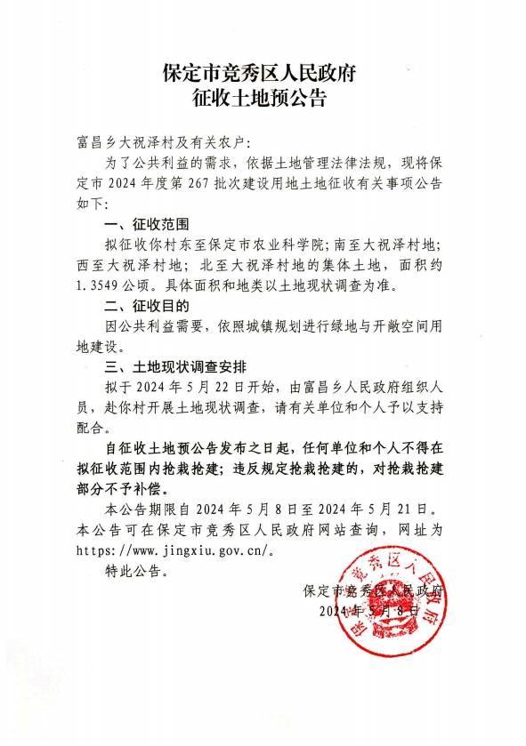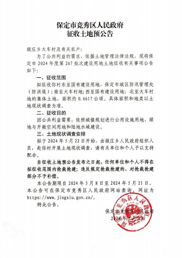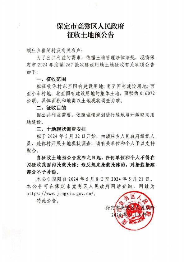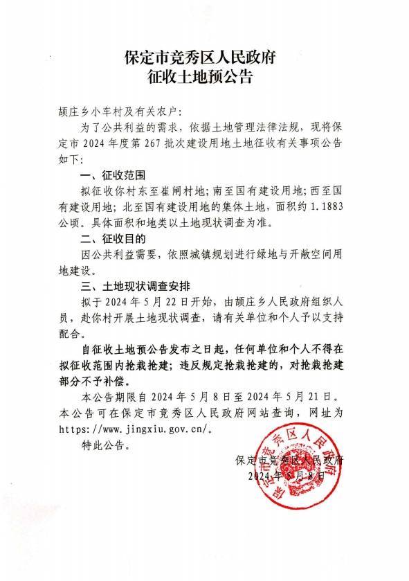 2024年5月8日,保定市莲竞秀区政府公布最新征地公告。此次征收土地公告涉及区域有颉庄乡大车村、小车村、崔闸村和富昌乡大祝泽村。