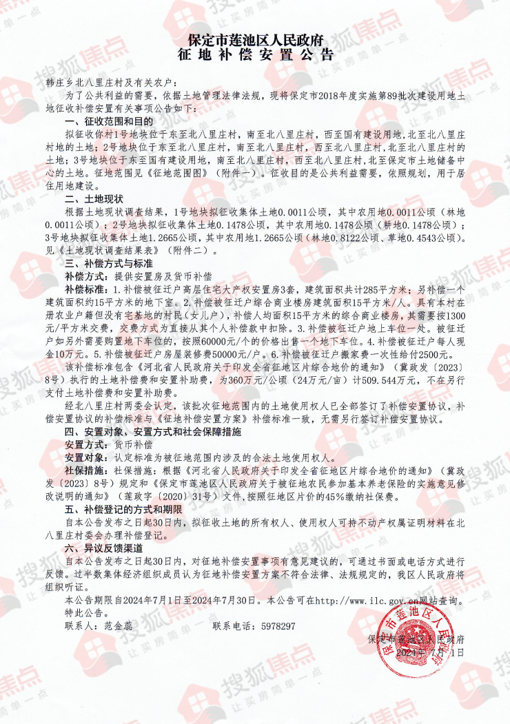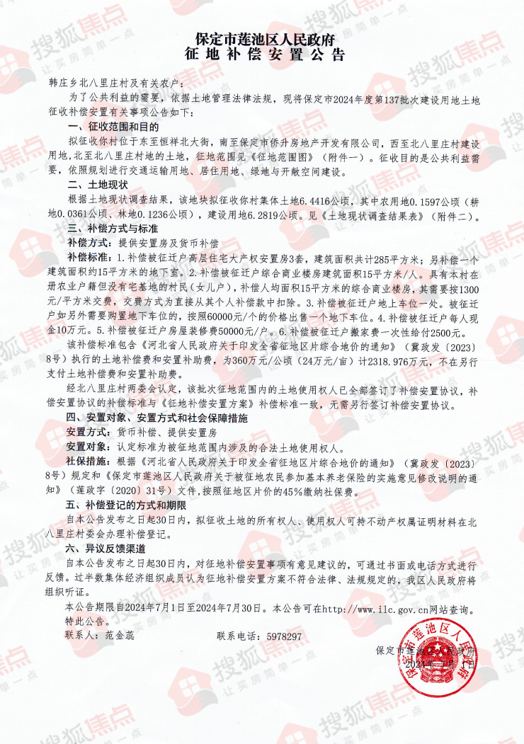 保定莲池区发布北八里庄村征地补偿安置公告,补偿标准24万元/亩