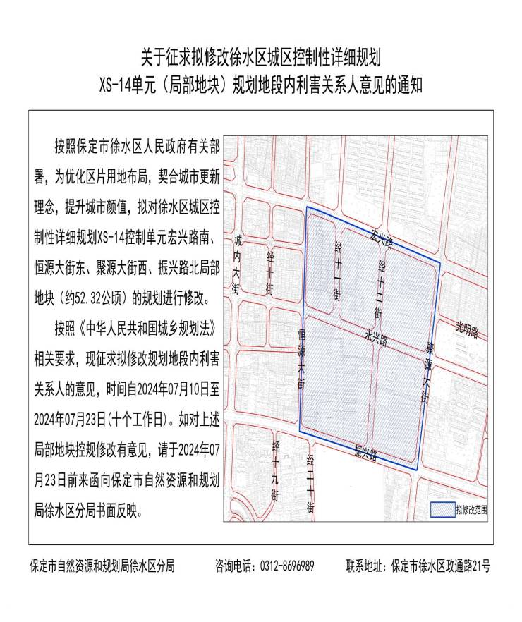 根据《中华人民共和国城乡规划法》相关要求,现征求拟修改规划地段内利害关系人的意见,时间自2024年7月10日至2024年7月23日(十个工作日)。如对上述地块控规规划修改有意见,请于2024年7月23日前来函向保定市自然资源和规划局徐水区分局书面反映,并提供产权证明相关资料。