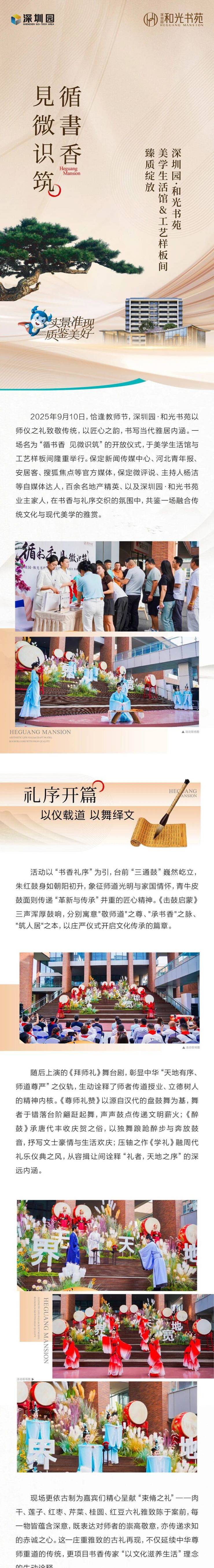 2025年9月10日,恰逢教师节,深圳园·和光书苑以师仪之礼致敬传统,以匠心之韵,书写当代雅居内涵。-场名为“循书香 见微识筑”的开放仪式,于美学生活馆与工艺样板间隆重举行。