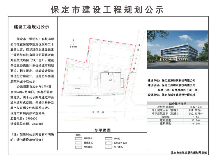 保定三源纺织科技有限公司异地迁建升级技改项目(2#厂房)将在保定市莲池区规划二十五路以西,荷华路以北建设。公示期为7月9日至18日,如有异议请在公示期内反馈。建设单位联系电话为2169486,自然资源和规划局监督电话为5902600。