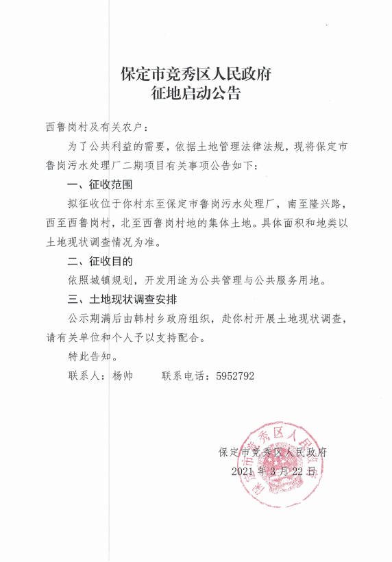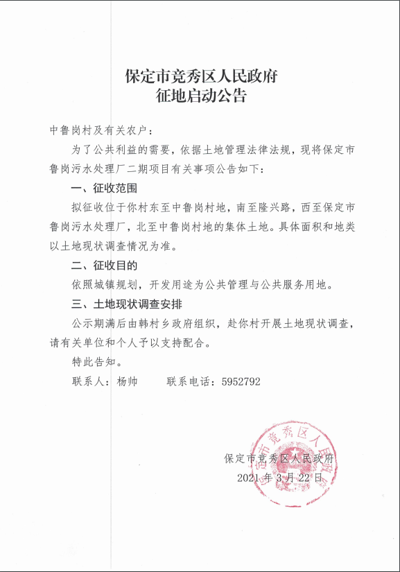 征地丨保定中鲁岗、西鲁岗发布征地启动公告 涉污水处理厂项目