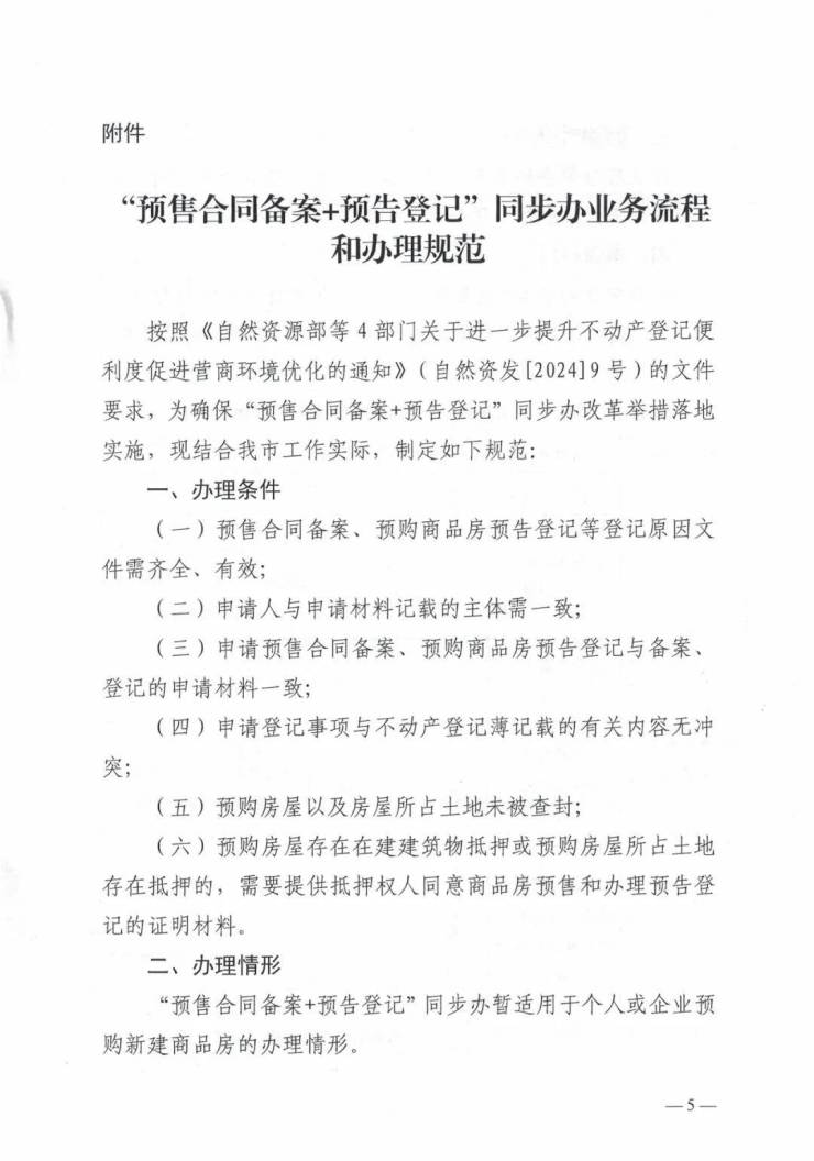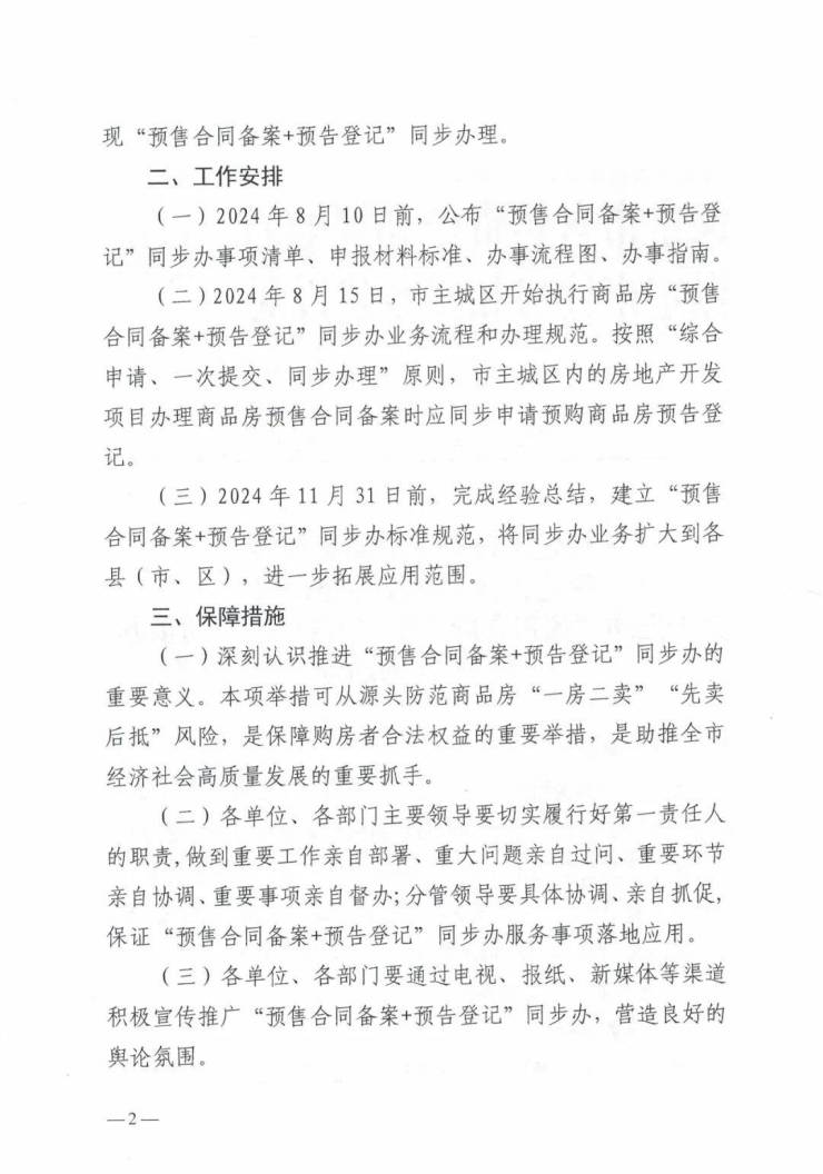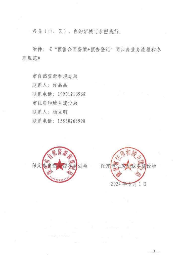 由市自然资源和规划局、市住房和城乡建设局联合印发的《关于推动“预售合同备案+预告登记”同步办改革工作的通知》(保自然资规字〔2024〕142号)中指出,自8月15日起,市主城区内的房地产开发企业在办理商品房预售合同时,同步申请预购商品房预告登记,实现了“预售合同备案+预告登记”线上同步办理。