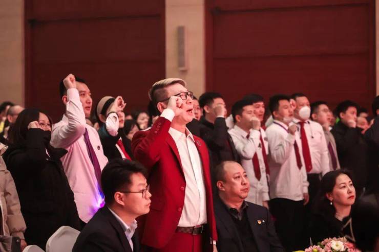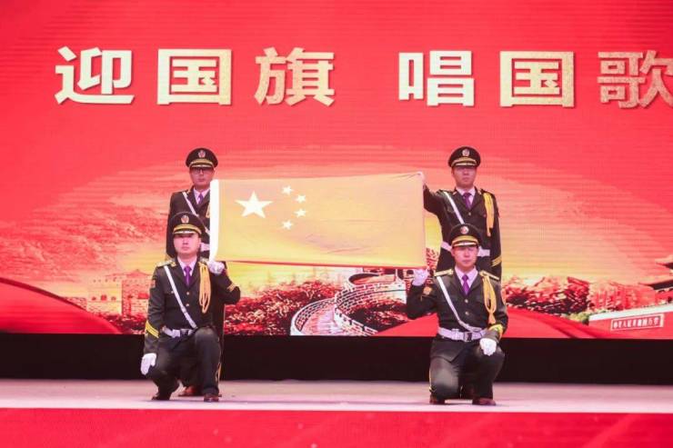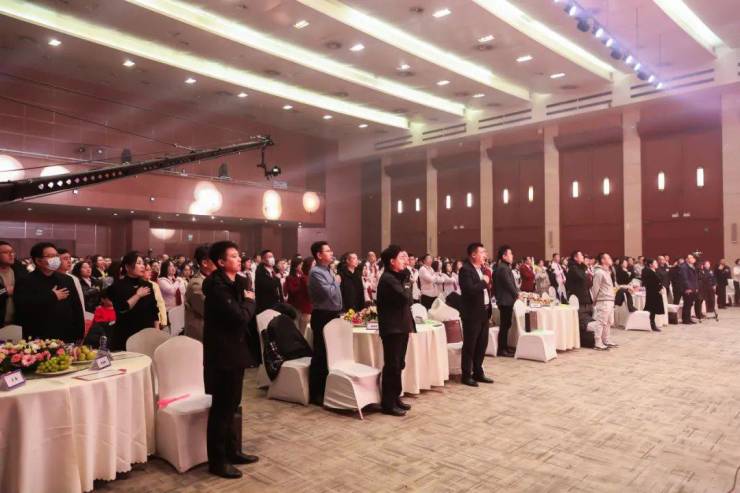 会场全体人员起立,共同迎国旗、唱国歌。汉谷家人齐声高喊我们的使命和愿景,不忘初心,肩负使命。