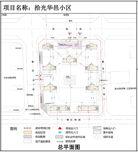 河北华中房地产开发有限公司拟在旭阳路南、曹庄中街东、曹庄东街西、曹庄南路北,建设拾光华邑小区项目。建设单位已委托设计单位按城市规划要求、相关规定、建筑设计规范等进行方案设计,现将总平面图及主要效果图予以公示。
