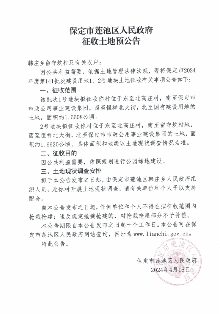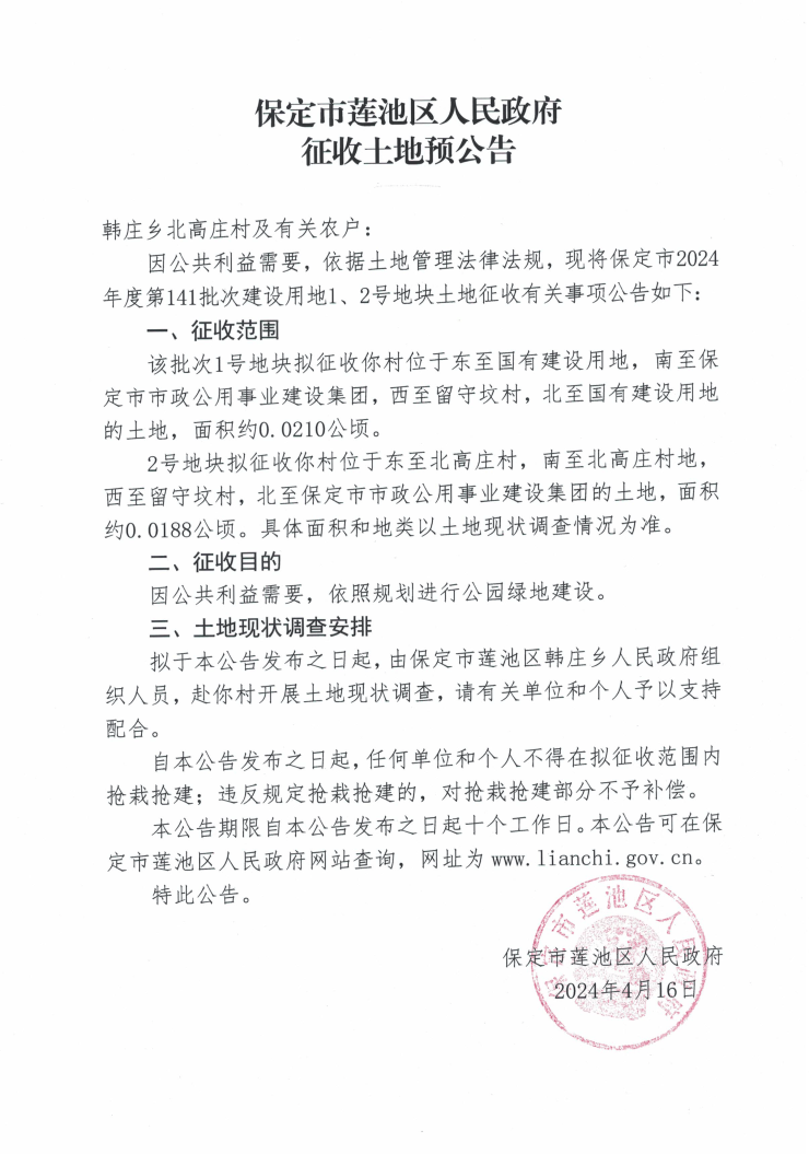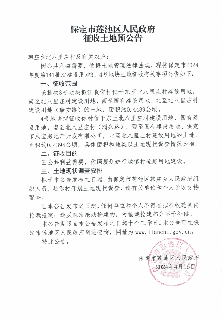 2024年4月16日,保定市莲池区政府公布三则征地公告,涉及韩庄乡北八里庄村、留守坟村、北高庄村,共征地2.1217 公顷,约合31.8255 亩。