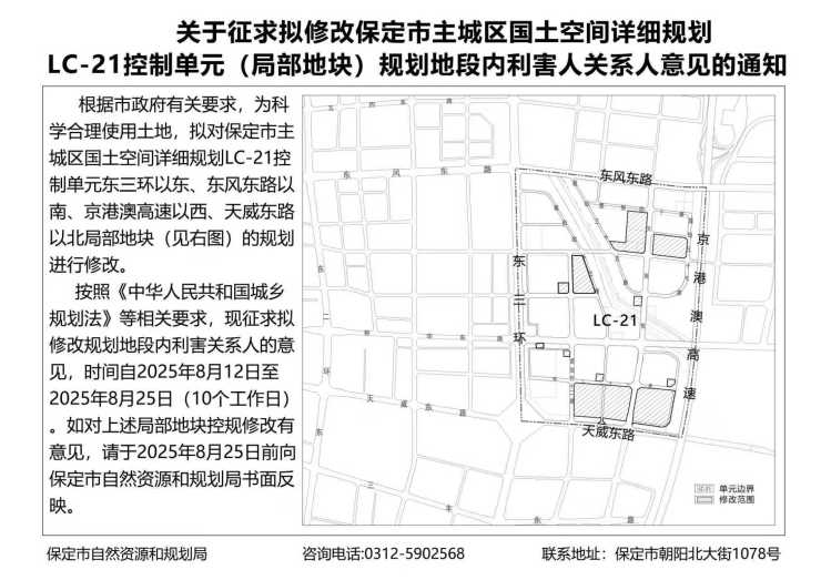 关于征求拟修改保定市主城区国土空间详细规划LC-21控制单元(局部地块)规划地段内利害人关系人意见的通知来源:保定市自然资源和规划局…