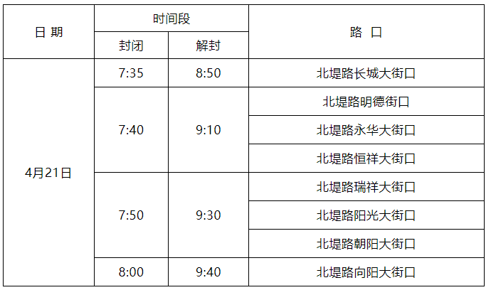 5.7:35至9:40北堤路(复兴路至向阳大街段)实施临时交通管制。沿北堤路各信号灯交叉口分时段实施临时交通管制,具体管控时间如下: