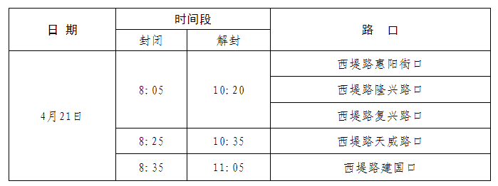4月21日比赛期间,赛道沿线及周边道路交叉口将按“滚动封闭、分段解除”的形式实施临时交通管制措施,具体管控时间如下: