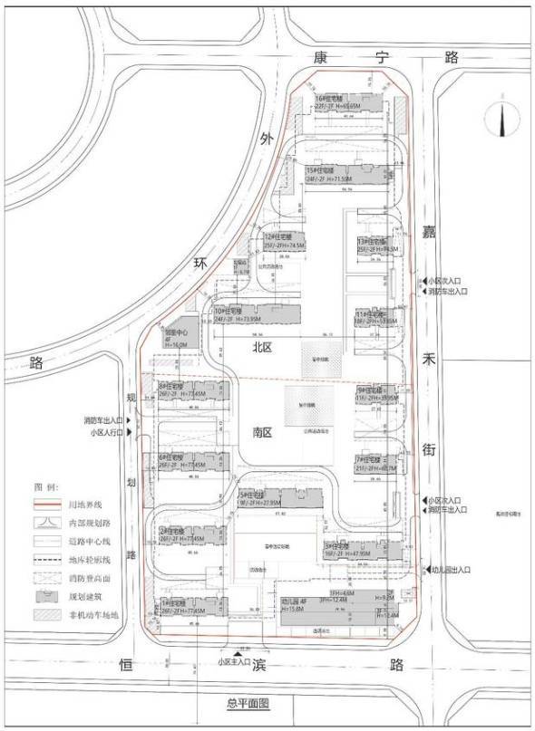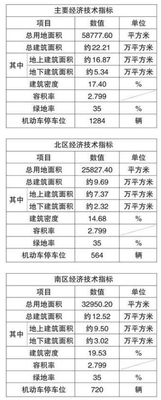 项目划分为南北两区,其中北区用地面积约25827.40平方米(约38.74亩),总建筑面积约9.69万平方米,其中:地上建筑面积约7.37万平方米,地下建筑面积约2.32万平方米。南区用地面积约32950,20平方米(约49.43亩),总建筑面积约12.52万平方米,其中:地上建筑面积约9.50万平方米,地下建筑面积约3.02万平方米。