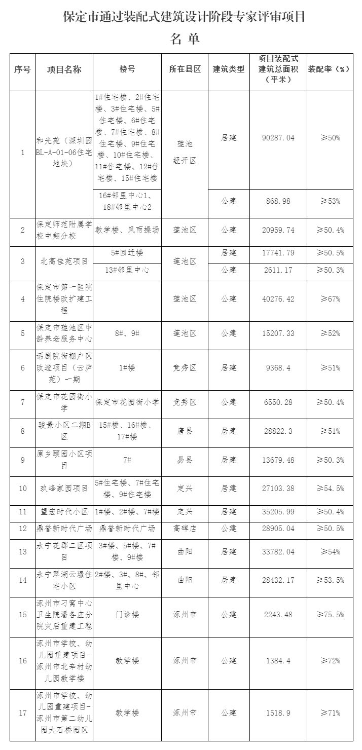 经项目建设单位申请,我局建筑产业现代化促进中心组织专家对保定市莲池经开区和光苑等项目(具体名单附后)进行了装配式建筑设计阶段装配率及关键性技术专家评审。现以上项目经专家组认定符合河北省《装配式建筑评价标准》要求,通过设计阶段专家评审。
