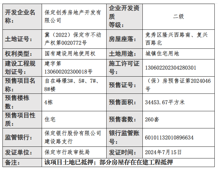 2024年7月15日,保定市行政审批局公布了一则商品房预售许可证下发公告,自在峰璟3#、5#、7#、8#楼商品房获预售许可,共4栋楼楼。商品房预售证号为(保)房预售证第2024046号,预售面积34453.67平方米,预售套数260套。